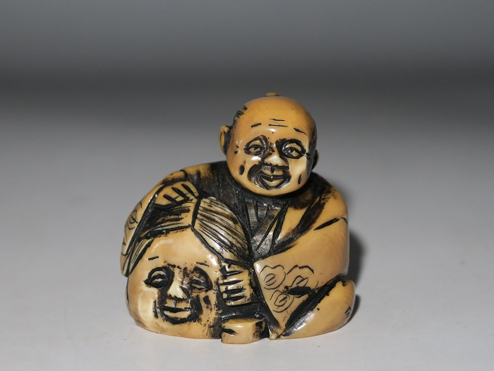 购于银座古玩城,明治时代的塑料仿象牙。没有绳孔,不能叫根付,只能算迷你摆件。日本各地古玩城和雅虎所谓的“象牙根付”,99%都是此类货色。价格合适买一个回去当样品不错,不触摸实物,永远无法分辨真假。
