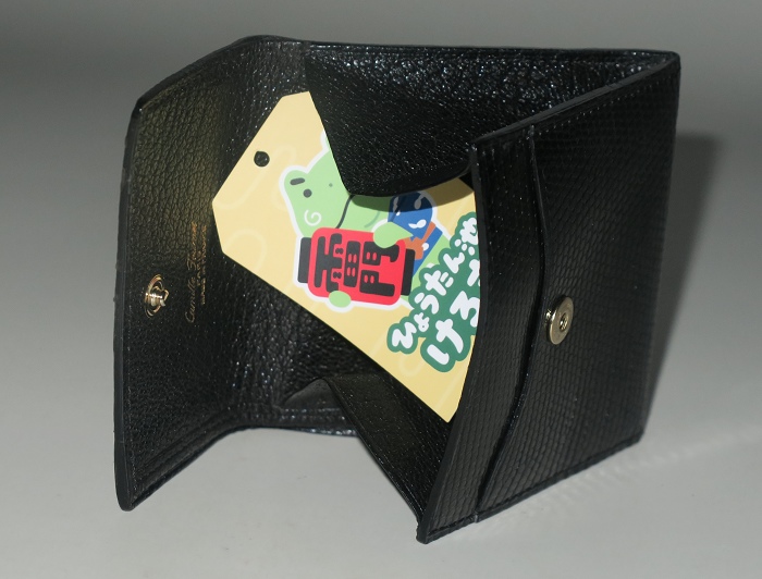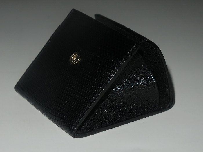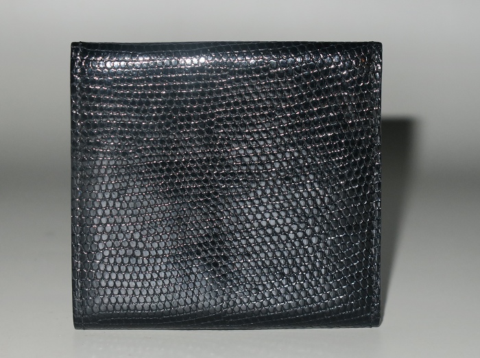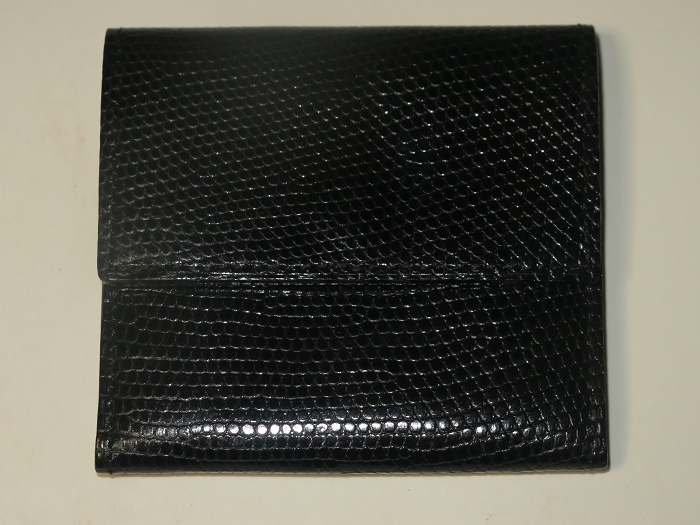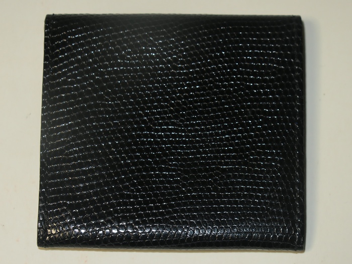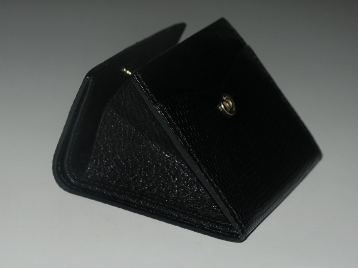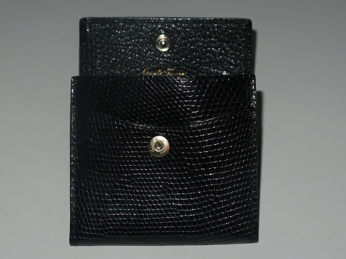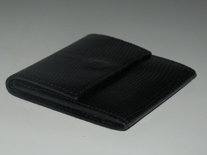卡米富尔奈(Camille Fournet)纯手工缝制的男女通用黑色蜥蜴皮零钱包:隔层可当作迷你卡袋(小票类)和钞票夹使用,设计方便拿取。设计灵感来自于1960年代的地铁票夹,将上等材质、现代风格和灵活性结合一起。每一件作品从选料、下料、粘合、缝纫、边沿整善,到成品组合,全程由一名师匠纯手工用传统工具精心制作而成,成品被赋予“艺术钱包”的美誉。