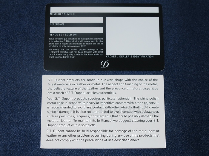 ST DuPont Japon Co., Ltd.,型号183461,烟盒外侧刻印:「S.T.Dupont PARIS」, 內侧刻印:「MADE IN SPAIN UX03」。原装外盒,产地证明和保修卡全套齐。全新且未使用,但保存过程中可能会出现岁月痕迹敬请理解。