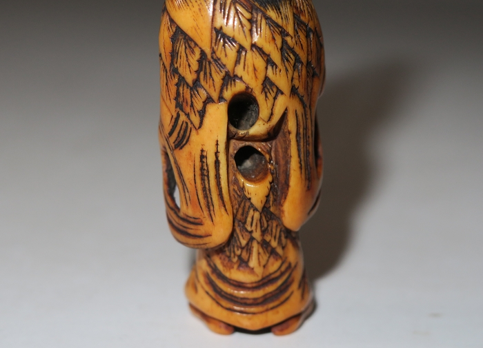 Old man from China.this carved is in the form of a Daoist sennin, dressed in a robe and cape of mugwort leaves, There are two cord holes in his back. Gama sennin standing, smiling as he holds a gourd flask over his shoulder. carved wearing long open robes, holding a gourd spray with a toad seated on his shoulder.
