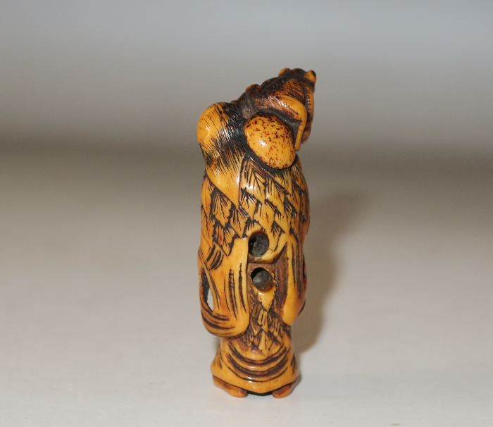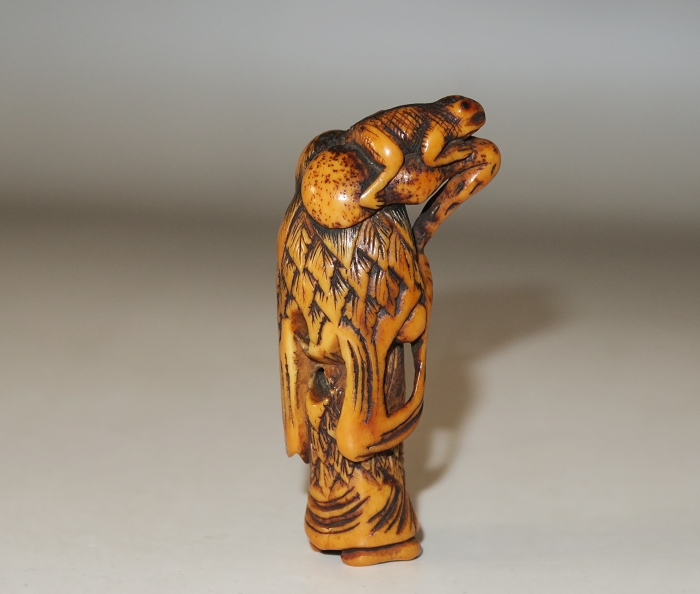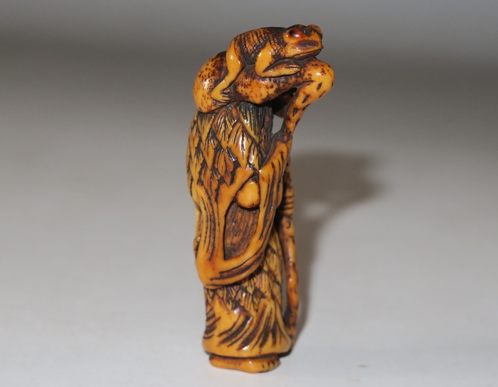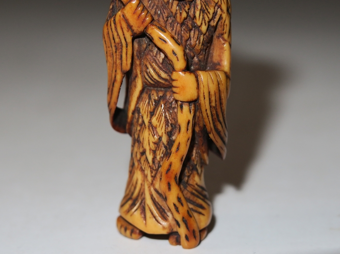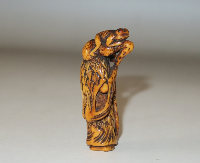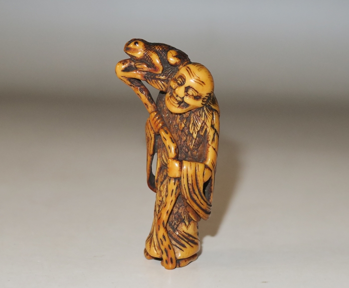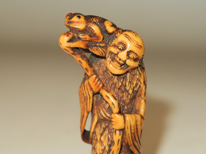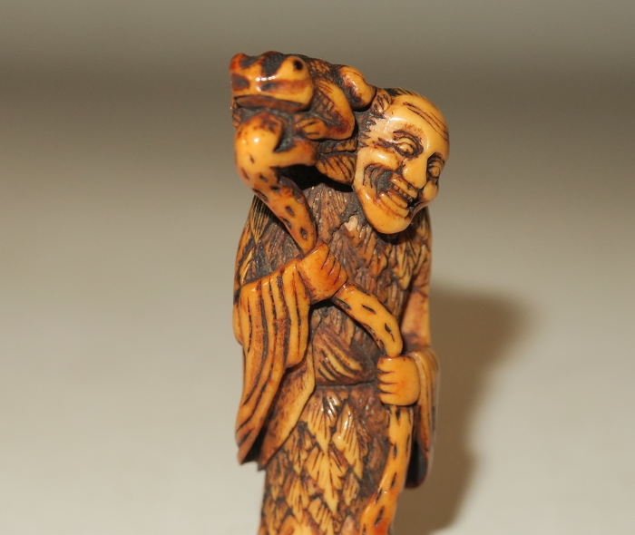 Old man from China.this carved is in the form of a Daoist sennin, dressed in a robe and cape of mugwort leaves, There are two cord holes in his back. Gama sennin standing, smiling as he holds a gourd flask over his shoulder. carved wearing long open robes, holding a gourd spray with a toad seated on his shoulder.
