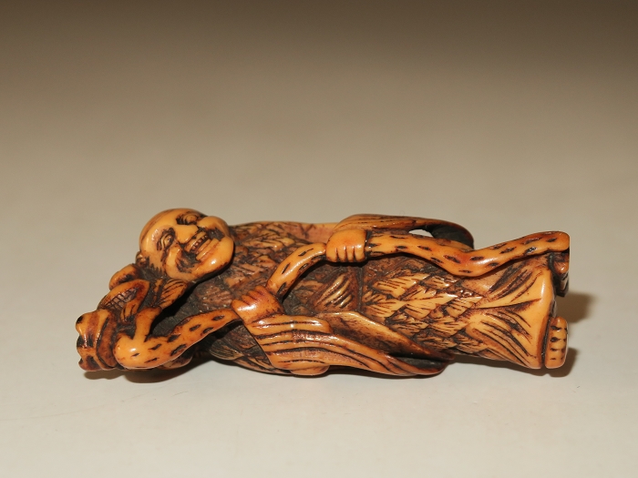 Netsuke were made in a variety of forms, the most widely appreciated being the katabori (shape carving), a three-dimensional carving. This one is in the form of a sennin (Daoist immortal).