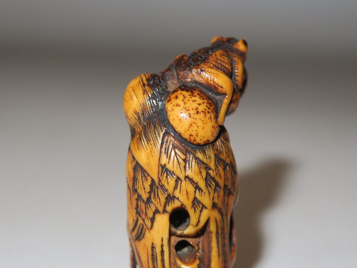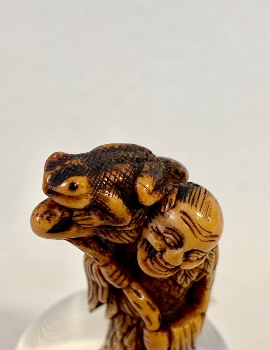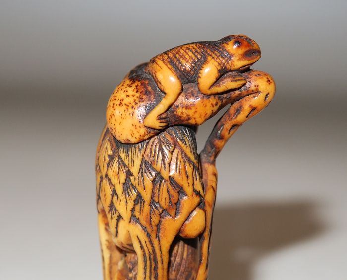 鹿角雕根付中鬼斧神工,巧夺天工之极品,蛤蟆仙人是早期根付常见题材,但铁拐李和蛤蟆的题材极为罕见。