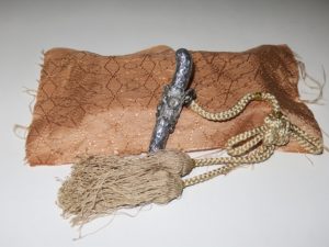 连鞘长约10cm,鞘长约6.5cm,刃长约5.5cm,锷宽约1cm,重约77.2g(含流苏)。银鞘周身通体装饰花草纹样,高浮雕花卉,两侧镂雕枝叶,精巧细致,华丽异常。银刀做工一丝不苟,尖刃齐全。明治六(1873)年维也纳万国博览会日本官方展示品,超绝技巧莳绘登峰造极之上佳作品。购于巴黎美术俱乐部(非公开沙龙),原装擦拭用锦缎保存完好,原藏者特制收纳桐箱,状态上佳。