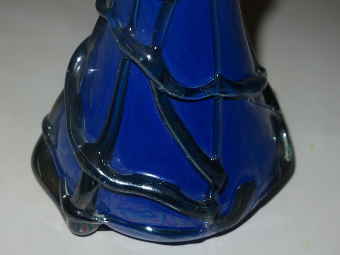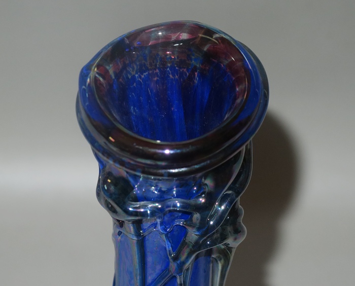 古董装饰艺术玻璃花瓶,形状为马蹄莲(矢车菊,拉丁语马蹄莲),主色调为深蓝色、乳白色和浅绿色。浮雕花茎缠绕在花瓶的两侧,脖子上缠绕着一株开着独特黄色花朵的植物。花瓶状况完好,无划痕污渍。