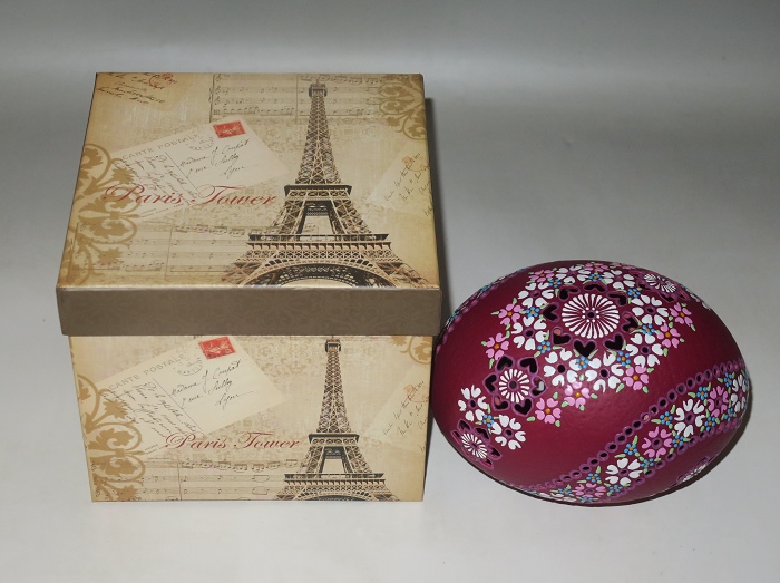 Pštrosia kraslica emu, v pôvodnej růžový,, vyrezávaná, kolorovaná farebnými trblietkami. Každá kraslica je originál, jednotlivé detaily sa môžu mierne líšiť, čo nie je dôvodom na reklamáciu.