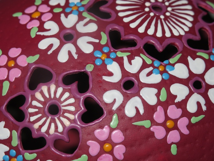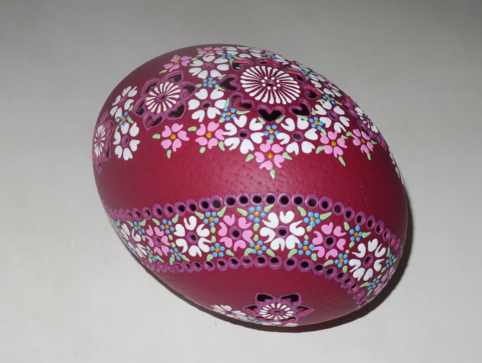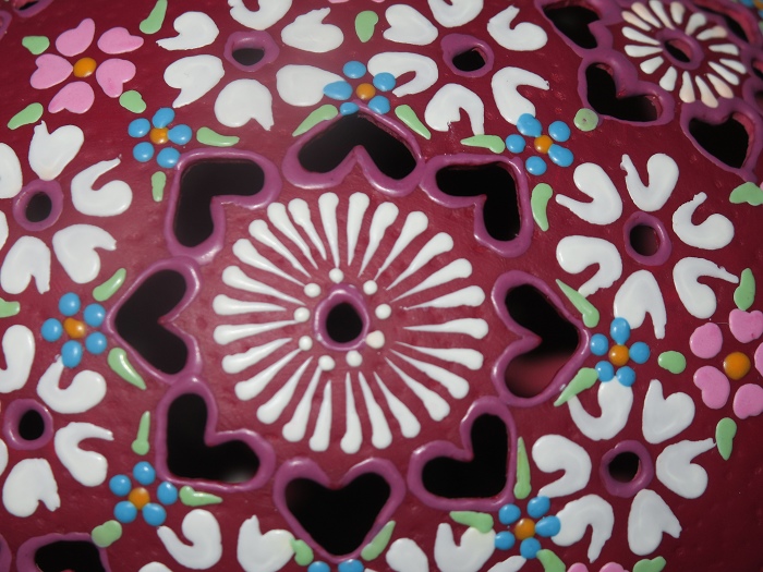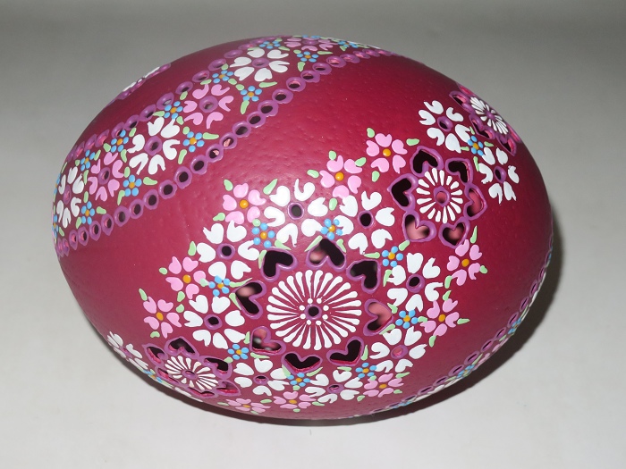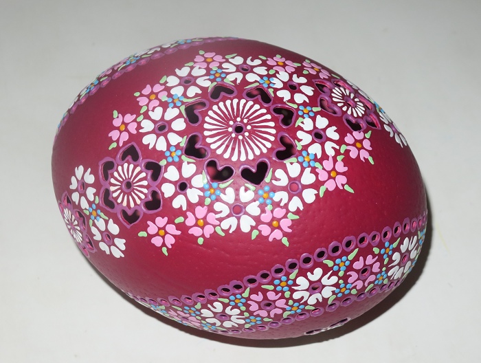 采用“马德拉技法(钻孔和蜡染)”在鸵鸟蛋上钻刻小孔形成图案。由于此种图案类似捷克和斯洛伐克传统的“马德拉刺绣法”,因此又名“马德拉彩蛋”。制作时先在倒空的鸵鸟蛋上画一个粗稿,然后用迷你工艺钻或锥子钻一个小孔,消毒并彻底干燥。最后用嵌入角撑板的尖笔在钻孔上涂抹加热的蜂蜡。