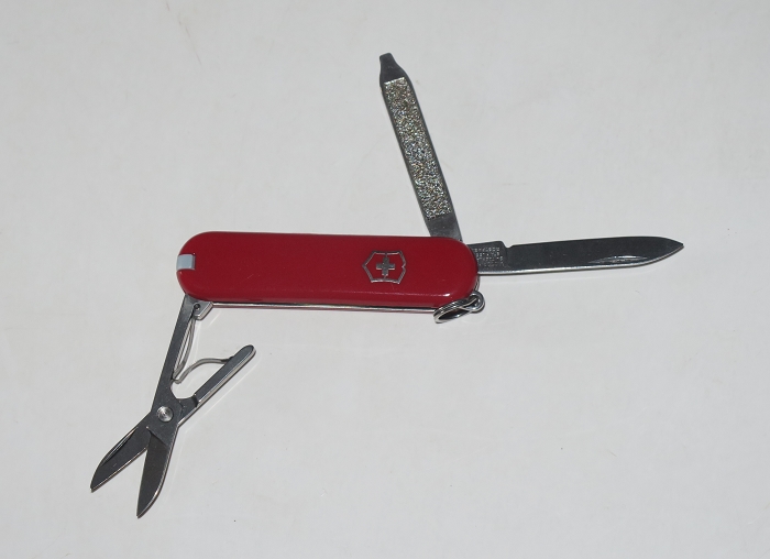 7种功能:小刀(约3.3cm)、剪刀、指甲锉、一字螺丝刀(约0.2cm)、镊子、牙签、钥匙圈。