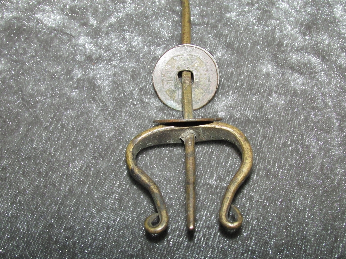 全长约12.8cm,重约54.82克,清中期制。附三枚铜钱,一康熙通宝,一宽永通宝,一磨损难辨。三叉戟为道教法器,具有威慑鬼怪、辟邪压胜功效。