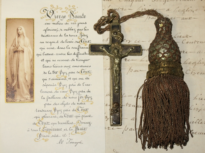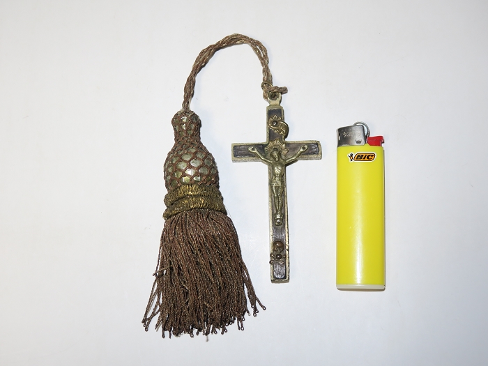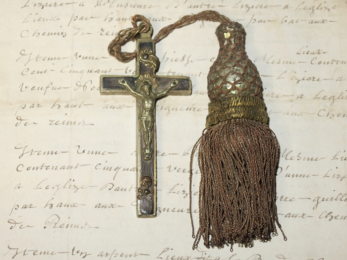 十字架裏面の中央に刻まれている「茨の冠」は、キリストの胸を突いた槍と同じく、聖書の中の「鶏が鳴く前に私を三回知らないと言うだろう」とキリストがペテロに告げたことを象徴。