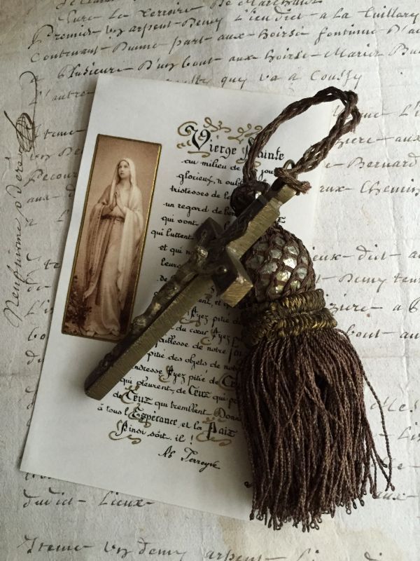 両手から血が滴るキリストの足下の髑髏は「死」を意味し、足の下にその髑髏があるということは「死への勝利」を意味。全体に刻まれているのは、様々なキリストの受難具。「MISSION」は、カトリックの信仰活動(運動)の意味。