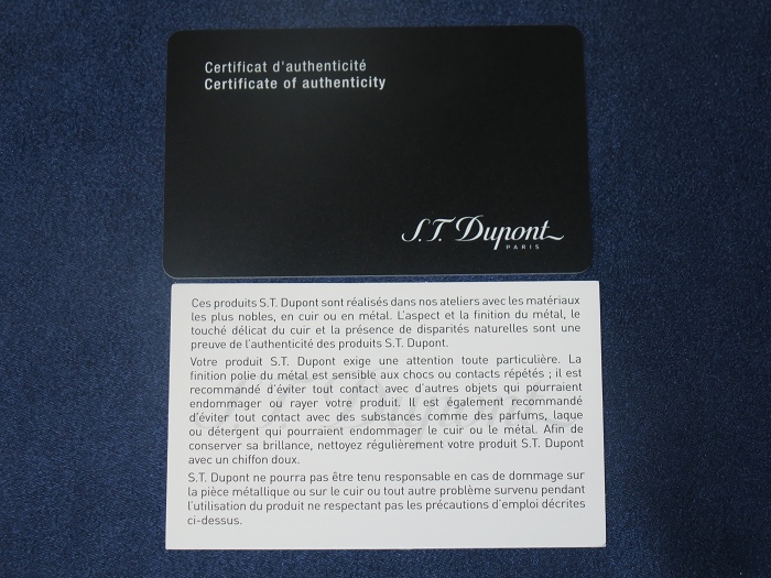 エス・テー・デュポン ジャポン株式会社でオーダーメイドの正規品。ケース外側刻印:「S.T.Dupont PARIS」, 內側刻印:「MADE IN SPAIN UX03」,箱・拭布、カード類全揃い。