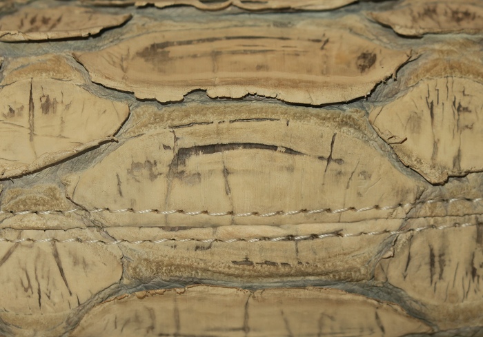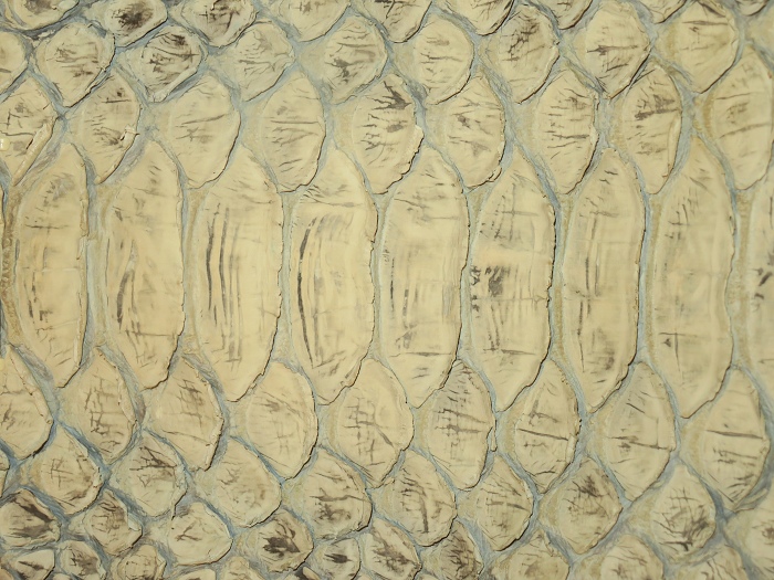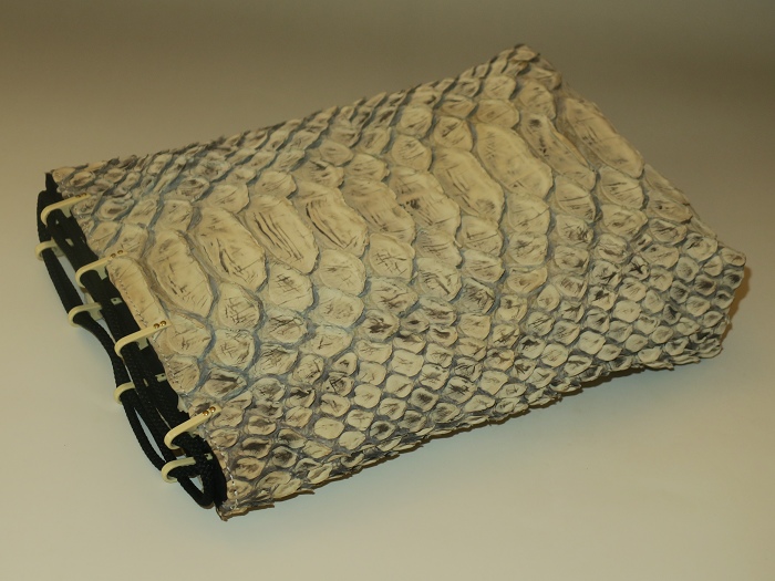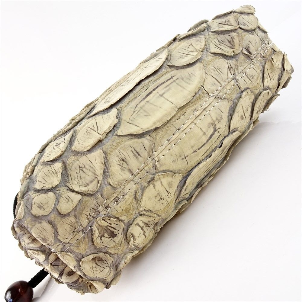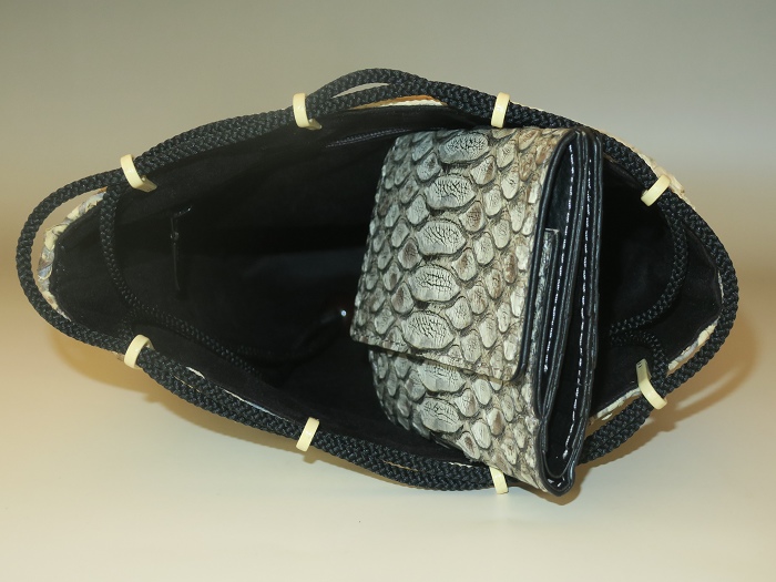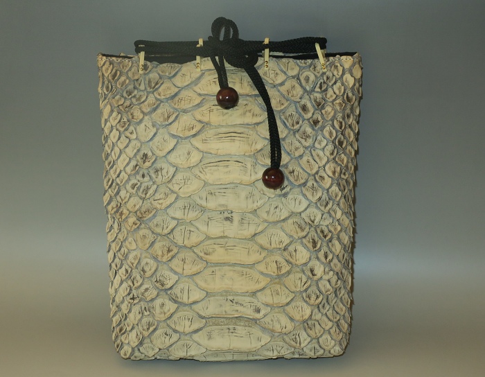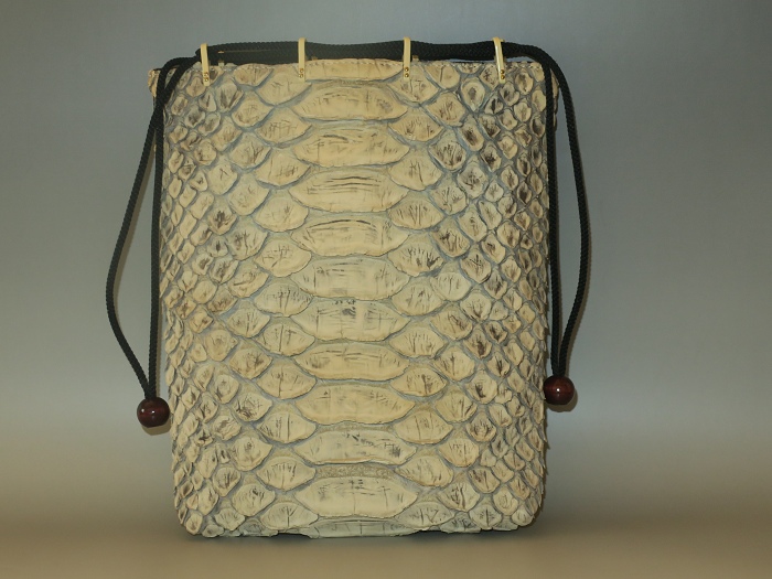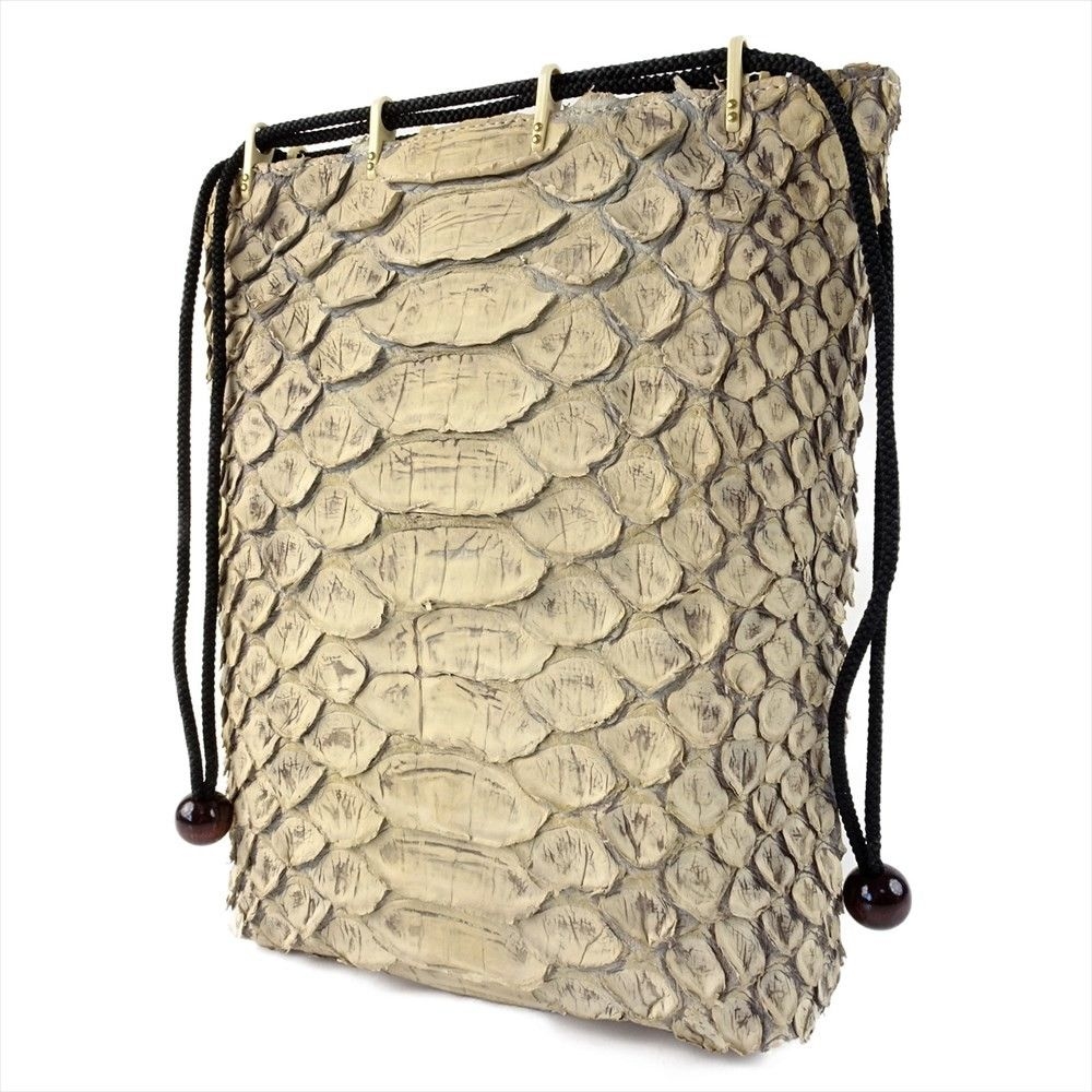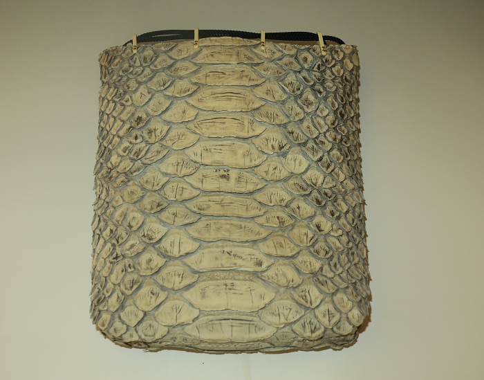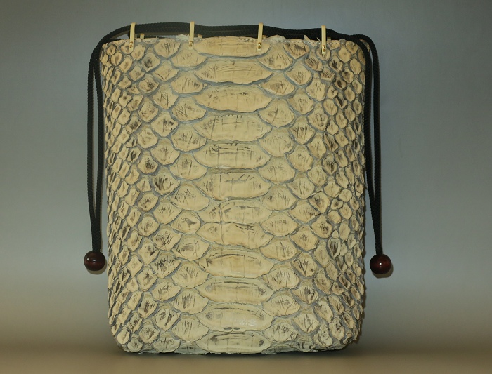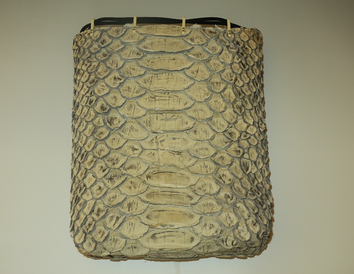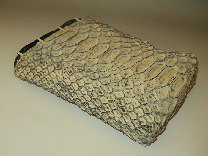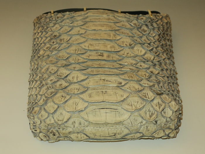 外側全面に人気のリアルパイソンレザーを使用。内側キャンバス。「フロントカット」といわれる背中側の一枚物を使用し、蛇特有の背中の鱗とその模様はとても迫力がある。色は人気の「ナチュラル」、使い込むごとにカーキブラウンの艶あり風合いになっている。