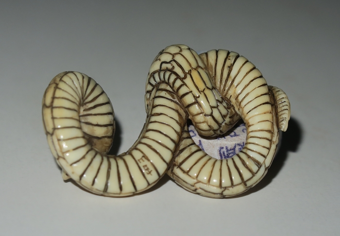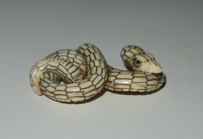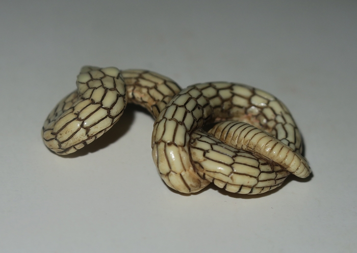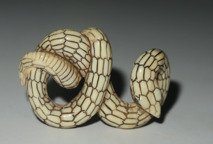 The Japanese ivory netsuke of a coiled snake by Kosan(古山)