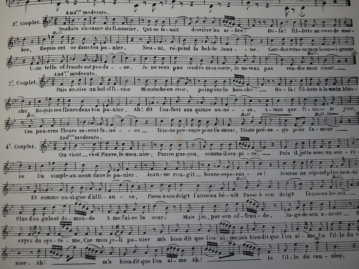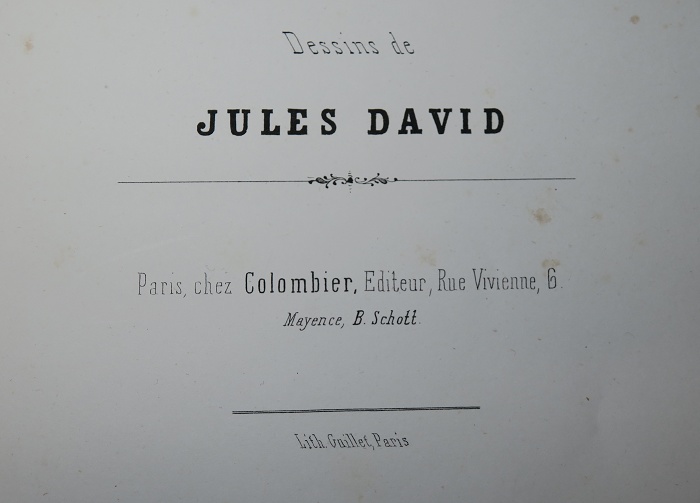 illustré de 24 planches de gravures sous serpentes, dessinées par Jules David, pour illustrer les 25 planches de partitions musicales ; couverture ornée d’un grand médaillon de motifs divers et d’un filet d’encadrement avec motifs floraux, dorés, ainsi qu’un ornement sur tout le dos ; toutes tranches dorées.