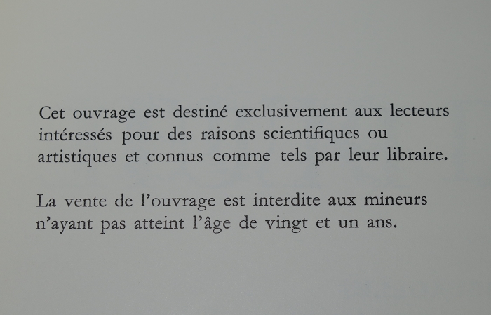 IN-FOLIO (27.5×36.5cm) DE 223 + (1) PAGES, RELIURE DE L’EDITEUR A LA BRADEL PLEINE PERCALINE ROUILLE, SOUS JAQUETTE ILLUSTREE EN COULEURS. BEL OUVRAGE EROTIQUE COMPORTANT 103 ILLUSTRATIONS IN ET HORS TEXTE EN NOIR ET BLANC ET 28 PLANCHES HORS TEXTE EN COULEURS. BON EXEMPLAIRE.